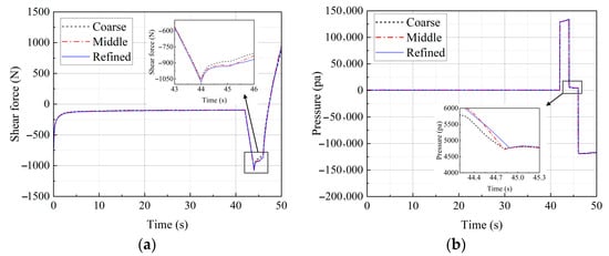 To ensure the accuracy and reliability of the numerical simulations, three mesh configurations with different resolutions were constructed by refining the wake region. Specifically, the coarse mesh consisted of approximately 6 million cells, the middle mesh comprised around 10 million cells, and the refined mesh included roughly 15 million cells. The comparison of simulation results under different mesh densities is presented in Figure 7. The coarse mesh overestimates the shear force magnitude, indicating inadequate resolution to accurately capture wake dynamics and boundary layer development. In contrast, the middle and refined meshes produce results that are in close agreement over the entire simulation period, with only minor discrepancies observed in regions of high gradient. The coarse mesh is unable to resolve these transient phenomena with sufficient accuracy, as evidenced by the over-smoothing of pressure peaks and delayed onset. The middle mesh accurately tracks the refined mesh in both peak amplitude and timing, demonstrating that it offers adequate resolution for capturing pressure transients.