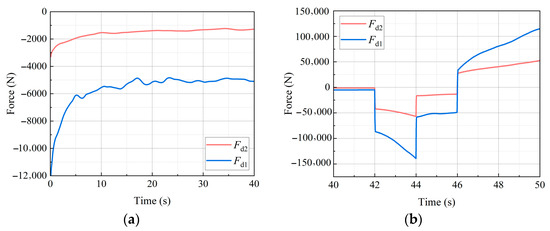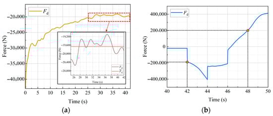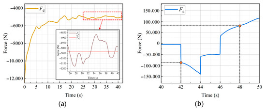 Figure 11 illustrates the variation in the hydrodynamic drag force acting on the vehicle under flow velocity . Figure 11a presents the drag force experienced by the vehicle during the steady velocity phase (at t = 0–42 s), while Figure 11b shows the drag force under the variable velocity phase (at t = 42–50 s).