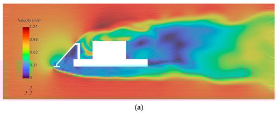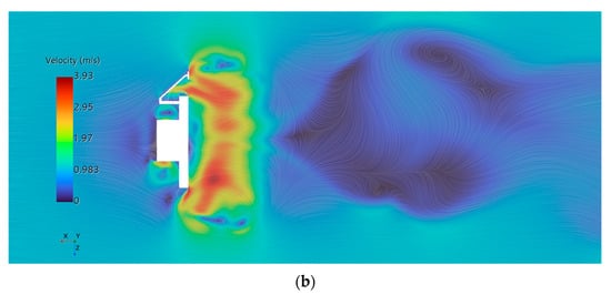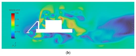 The DSMV exhibits significant differences in wake structure between uniform motion at 1 m/s and deceleration to 1 m/s. During steady motion, the flow remains relatively stable, characterized by the formation of regular vortex structures in the wake region, with the velocity field gradually reaching a stable state, as shown in Figure 9a. In contrast, during deceleration, changes in vehicle speed induce transient and unsteady interactions between the fluid and the vehicle body, leading to irregular vortex shedding and greater fluctuations within the velocity field, as illustrated in Figure 9b. These variations are primarily attributed to the inertial response of the fluid and the transient effects caused by changes in the vehicle’s speed on the surrounding flow field.