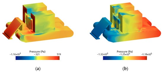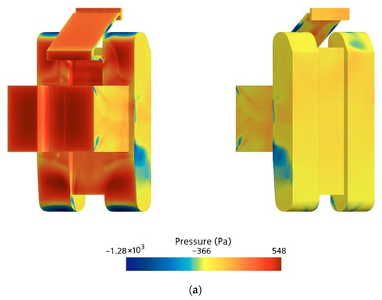As shown in Figure 10a, the pressure distribution on the vehicle surface at the steady-state flow field (t = 42 s) exhibits a distinct pattern. A high-pressure zone forms on the upstream-facing surface due to direct impingement by the incoming flow. In contrast, regions of high-speed flow along the inclined plane, roof, sidewalls, and bottom surface generally exhibit pronounced negative pressure. Figure 10b shows the surface pressure distribution during the vehicle’s deceleration phase. This stage is characterized by extensive negative pressure regions covering the sloped surface, top, sides, and bottom of the vehicle. Deceleration induces significant fluid inertia and added mass effects, making it difficult for the surrounding fluid to respond instantaneously to the rapid change in velocity. As a result, substantial momentum deficits and isolated fluid regions develop, resulting in a significant decrease in static pressure. Furthermore, the presence of high-speed jets along the slope and sidewalls, the stretching of shear layers, and the continuous shedding of recirculation bubbles and vortices at the rear serve to further intensify both the magnitude and extent of negative pressure zones. The vehicle’s complex geometry also contributes to pronounced spatial nonuniformity and heterogeneity in localized low-pressure regions.
