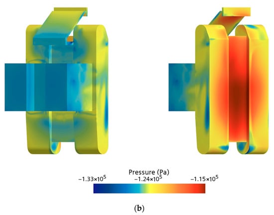 As shown in Figure 14a, the surface pressure distribution of the vehicle under vertical orientation in a uniform flow field reveals distinct hydrodynamic characteristics. A high static pressure region is formed on the upstream-facing surface due to direct impingement of the incoming flow, while accelerated flow along the sloped surface and sidewalls results in a significant reduction in static pressure. Vortex structures at the vehicle’s rear and in the recirculation, zone further reduce local surface pressure, creating extensive low-pressure regions. During the deceleration phase (Figure 14b), the vehicle surface experiences widespread negative pressure, mainly due to fluid inertia, added mass effects, and unsteady flow structures. The most significant low-pressure regions appear on the upstream face, sidewalls, and sharp geometrical transitions. This occurs because the surrounding fluid cannot instantly adjust to the vehicle’s speed reduction, causing a pressure imbalance. The added mass effect further lowers pressure by requiring the vehicle to decelerate the adjacent fluid. Accelerated flow along sloped and edged surfaces intensifies shear and reduces pressure via Bernoulli’s principle, and the vortex shedding at the rear also generates sustained low-pressure zones. These effects collectively amplify local stress concentrations and may impact system layout and vehicle stability.
