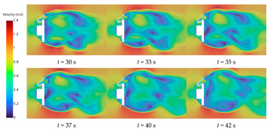As shown in Figure 11b, after the DSMV operates under steady flow conditions for a certain duration, the hydrodynamic drag stabilizes and begins to oscillate within a relatively narrow range. These oscillations are closely linked to unsteady flow phenomena such as boundary layer separation and vortex shedding, as illustrated in Figure 12, which captures the wake evolution and vortex dynamics around the transverse vehicle body. Flow field snapshots from t = 30–42 s demonstrate periodic vortex shedding from both the upper and lower trailing edges of the vehicle. The presence of swirling streamlines, along with temporally evolving velocity contours in the near-wake region, indicates the development of a vortex street pattern, which exhibits increasing asymmetry as time progresses. A distinct boundary layer separation is observed at the upper trailing edge, where regions of high velocity gradients detach from the vehicle surface into the wake. At later time instants (at t = 40–42 s), partial flow reattachment is observed in the downstream region, as indicated by a narrowed wake and the emergence of more organized and symmetric flow structures. Furthermore, the shear layers originating from the vehicle’s sharp lateral edges become unstable and roll up into vortices that propagate downstream, contributing to the unsteady pressure drag experienced by the vehicle.