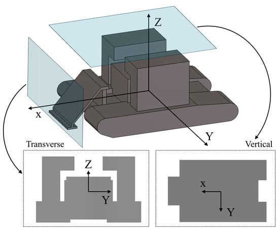 Hydrodynamic coefficients are fundamental dimensionless parameters that characterize the interaction between a body and the surrounding fluid. These coefficients are essential for accurate hydrodynamic modeling. This study focuses on a deep-sea mining vehicle (DSMV) designed for collecting polymetallic nodules from seabed depths of approximately 5000 m (Figure 1). Its complex geometry, required for seabed operations, leads to significant hydrodynamic interactions during prolonged deployment and retrieval phases. During these phases, the vehicle is significantly influenced by hydrodynamic forces. Therefore, the primary objective of this study is to determine the hydrodynamic load coefficients of the DSMV under submerged conditions, providing a theoretical basis for achieving stable motion control during deployment and retrieval operations. For the Deep-Sea Mining Vehicle (DSMV), these coefficients constitute the foundation for formulating the equations of motion and performing hydrodynamic predictions required for control system development [1,2,3].