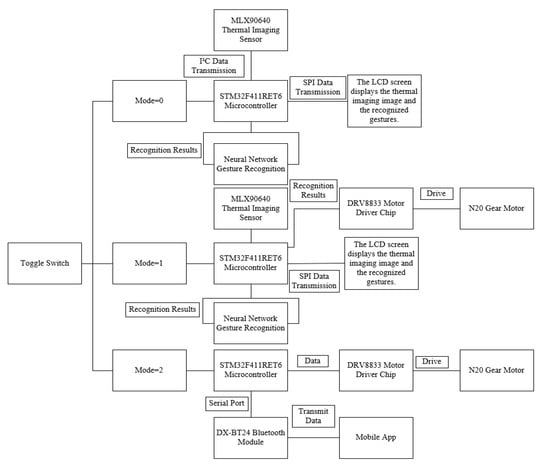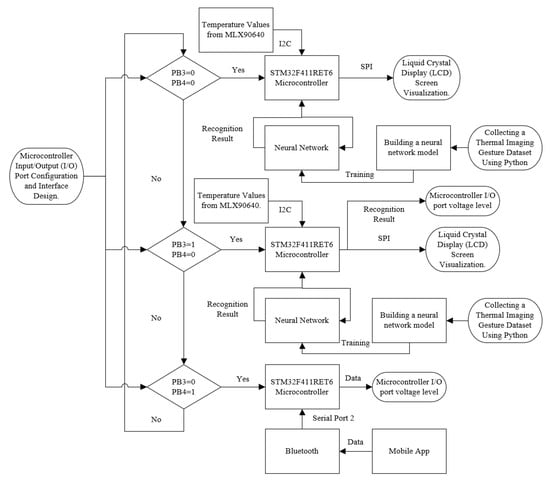 Three control modes are controlled by a three-position toggle switch, as shown in Table 1. During platform operation, the microcontroller first checks the state of the boat-type switch connected to its IO ports. If the switch is toggled to position 0, both input IO ports of the microcontroller are set to low level, activating Mode 0. In this mode, the platform’s functionality is limited to capturing thermal images, performing recognition, and displaying the images and recognition results on the LCD screen. The MLX90640 sensor transmits the temperature values of each pixel within the measurement area to the STM32F411RET6 microcontroller via the I2C bus. The microcontroller maps these temperature values to a 0–255 color scale and sends the corresponding RGB color data to the LCD screen via the SPI bus for display. Simultaneously, the microcontroller uses the embedded neural network program to recognize gestures from the thermal images and displays the recognition results on the LCD screen. Additionally, the LCD screen shows the highest and lowest temperatures within the measurement area.