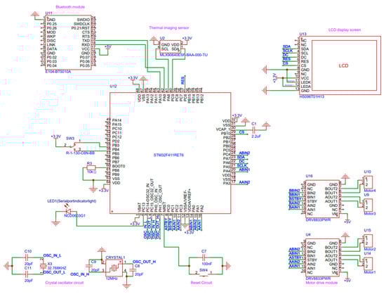 The logic of Bluetooth control has been outlined in Section 2.1, and it is elaborated in detail here. When the toggle switch is set to the corresponding position where PB3 is low and PB4 is high, the STM32F411RET6 microcontroller enters the Bluetooth control mode. In this state, the thermal imaging sensor and LCD screen are deactivated. The Bluetooth module connects to the microcontroller via a serial port, with its baud rate adjusted from the default 9600 to 115,200 using AT commands to match the microcontroller’s serial communication settings. Once the mobile app pairs with the Bluetooth module, it sends pre-set control commands. The module transmits these commands to the microcontroller through the serial port. The microcontroller then interprets the commands and outputs corresponding level signals via its GPIO pins. These signals drive the DRV8833 motor driver module and N20 geared motors, enabling the robot car to perform movements such as forward, backward, left shift, right shift, and stopping.