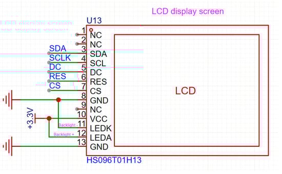 Figure 4 illustrates the circuit diagram of the LCD adapter board, detailing the functionality of the eight pins as follows: The CS (Chip Select) pin is utilized to designate the LCD as the target device for communication by transmitting control signals. The VCC pin supplies power to the screen, connected to a 3.3V source. The SCK (Serial Clock) pin, integral to the SPI (Serial Peripheral Interface) communication protocol, facilitates the transmission of clock signals. The SDA (Serial Data Line) pin, also part of the SPI protocol, is responsible for data transmission. The DC (Data/Command) pin determines whether the transmitted signal is interpreted as data or a command; a low signal indicates a command, while a high signal signifies data. The RST (Reset) pin, active low, initiates a reset of the LCD to its initial state upon receiving a specific level signal. The GND (Ground) pin provides the grounding for the screen. Lastly, the LEDK pin controls the backlight brightness of the LCD, enabling the adjustment of backlight illumination through level modulation.