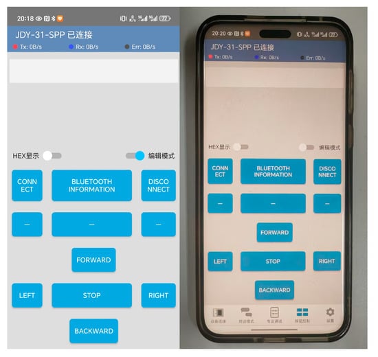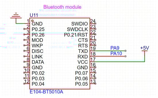 In this design, the baud rate of the microcontroller’s serial port is configured to 115,200, whereas the E104-BT5010A Bluetooth module is factory-set to a baud rate of 9600. Consequently, it is necessary to initially connect the module’s serial port to a computer via a USB-TTL module and utilize serial port assistant software to input AT commands to alter the Bluetooth module’s baud rate []. Figure 6 shows how to wire the pins of the Bluetooth module. For data transmission using the Bluetooth module, the VCC pin of the module is supplied with 5 V, and the GND pin is grounded. The RXD pin of the Bluetooth module is connected to the TXD pin of the microcontroller, and the TXD pin of the Bluetooth module is connected to the RXD pin of the microcontroller. The official smartphone application provided by Daxia Longque is then used to connect to the Bluetooth module and transmit data to it, which the Bluetooth module subsequently relays to the microcontroller via the serial port.