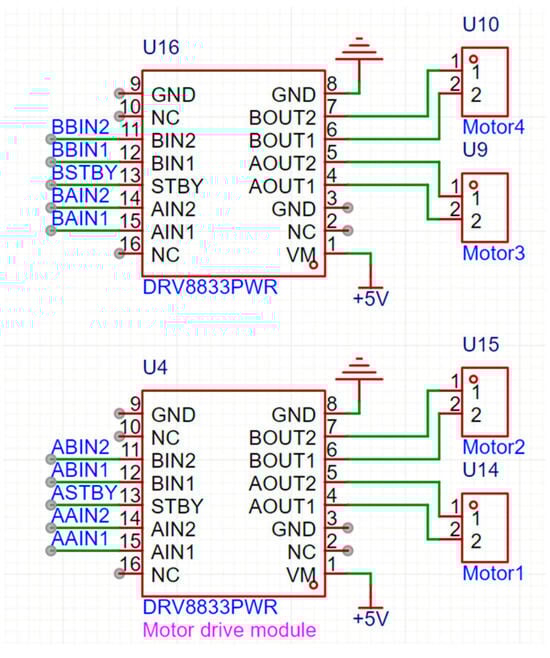 In Figure 7, the pin diagram of the DRV8833 motor driver module is presented. The AIN1, AIN2, BIN1, and BIN2 pins are connected to the IO ports of the microcontroller. The AO1, AO2, BO1, and BO2 pins are respectively connected to the positive and negative terminals of two DC motors, with the high and low level outputs from the microcontroller’s IO ports controlling the forward and reverse motion of the motors. The STBY pin is connected to a high-level output pin of the microcontroller to ensure normal operation of the motors. The VM pin, serving as the power supply pin for both the module and the motors, can accommodate a voltage range of 2.7 to 10 V. In this design, the driving voltage for the DC motors is set at 3V. Given that the microcontroller only provides 3.3 V and 5 V power outputs, the VM pin of this module is supplied with a 3.3 V voltage in the context of this design.