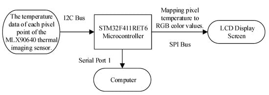 The flowchart of the program design for this section is illustrated in Figure 9. The MLX90640 thermal imaging sensor captures temperature values from a 24 × 32 pixel array and transmits these values to the STM32F411RET6 microcontroller via the I2C bus. The microcontroller then extrapolates the 24 × 32 pixel data from the thermal imaging sensor to fit the 135 × 240 pixel resolution of the LCD screen. It maps the received temperature values to a color scale ranging from 0 to 255 and sends the color data to the LCD screen for display through the SPI bus. Simultaneously, the microcontroller transmits the 24 × 32 temperature values of a single thermal image to a computer via Serial Port 1, where these temperature data are processed and stored.