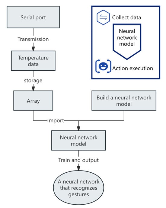 The flowchart illustrated in Figure 10 delineates the process of saving arrays and training a neural network using Python. Initially, Python stores the data received from the serial port as arrays, then constructs a neural network model, and subsequently trains and outputs the neural network using the stored arrays. When Python receives data from the serial port, it first configures the serial port settings to ensure the baud rate matches that of the lower-level machine. Two arrays are then defined: one to store the temperature values of the 24 × 32 pixel points of the image, and another to store the labels corresponding to each image. A total of 50 image data sets are intended to be received. The process of populating the arrays with data is omitted here, and finally, the collected data is saved in an NPZ format file. The NPZ file, a binary format specific to NumPy, is utilized for storing and transmitting large volumes of numerical data and can contain one or more NumPy arrays. As a file storage format within the NumPy library, NPZ files effectively reduce file size, conserve storage space, and facilitate the organization, management, and cross-platform sharing of data. In the realms of scientific computing and data analysis, using NPZ files allows for the convenient storage of data within a single file, enabling the retrieval and reading of array data by name, thereby enhancing the efficiency and flexibility of data processing. In this design, the file stores a two-dimensional array for image temperature data and a one-dimensional array for label values. After collecting a sufficient number of image data, all NPZ files containing the data are merged into one, which is then saved as a new NPZ file.