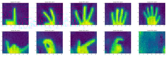 As shown in Figure 11, this is an example diagram of the visualization of the collected temperature data. The dataset contains 10 categories (corresponding to gestures 0–9), with a total of 7073 thermal imaging images. Each gesture category has approximately 500 to 900 images collected. The number of arrays for various gestures is listed in Table 3.Through Python programs, temperature data is stored as arrays and used to create datasets. When collecting thermal imaging gesture data using Python, the corresponding labels are recorded synchronously while storing temperature data as arrays. When merging datasets, the one-to-one correspondence between images and labels is maintained. These datasets are used to train Keras-based neural network models. The study trained the model using collected raw data without employing data augmentation to improve the reliability of model training.