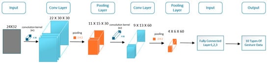 In Figure 12, the architecture of the neural network is presented, constructed in a sequential manner where the output size of each layer serves as the input for the subsequent layer. The purpose of setting convolutional kernels is to scan the image row by row and column by column, extracting feature values from each small region of the image. The formula for calculating the output image width of the convolutional layer is shown in Equation (1), the output image height in Equation (2), and the number of output image channels in Equation (3). The input image dimensions for the convolutional layer are (W, H, D), the number of convolutional kernels is N, the size of each convolutional kernel is (a, b), p is the padding number (p is 0 when no padding is applied), and S is the stride, which is the distance the convolutional kernel moves when scanning the image. If not set, the default stride is 1, both horizontally and vertically. The formula for calculating the output image width of the pooling layer is shown in Equation (4), the output image height in Equation (5), and the number of output image channels in Equation (6). The window size of the pooling layer is (c, d), the input image dimensions are (W, H, D), and S is the stride. If not set, the default stride is the width and height of the pooling layer window. According to the formula, the input image dimensions for the first convolutional layer of the neural network are (24, 32, 1), the number of convolutional kernels is 30, the convolutional kernel size is (3, 3), the padding mode is set to no padding, and the default stride is 1. The window size of the first pooling layer is set to (2, 2), and since the stride is not set, it defaults to the pooling layer window size, meaning both horizontal and vertical strides are 2. Therefore, the calculated output image dimensions of Pooling Layer 1 are (11, 15, 30), which serve as the input for the second convolutional layer. Consequently, the input image dimensions for the second convolutional layer are set to (11, 15, 30). At last, the hyperparameters used in the model training process are shown in Table 4.
