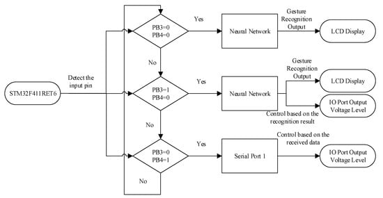 Shown in Figure 13 is the flowchart of the STM32 program for the design. First, the microcontroller detects the voltage levels of two input pins to determine the mode. When both input pins are at a low voltage level, the neural network is used to recognize gestures, and the image and recognition results are displayed on the LCD screen. When pin PB3 is at a high voltage level and pin PB4 is at a low voltage level, the neural network recognizes gestures and displays the results while controlling the voltage levels of the output pins based on the recognition results to control the movement of the platform. When pin PB3 is at a low voltage level and pin PB4 is at a high voltage level, the microcontroller receives data from the serial port and controls the voltage levels of the output pins based on the received data. After the neural network training is completed, INT8 quantization is used to optimize the model on embedded devices such as STM32, and the main purposes are to significantly reduce memory usage, improve computing speed, and lower power consumption. The neural network needs to be ported to the STM32 code using the X-CUBE-AI tool in the STM32Cube-MX software. After selecting the neural network, it is first analyzed. The analysis shows that the neural network occupies 411.78 KB of the microcontroller’s flash memory and 83.84 KB of the microcontroller’s RAM. The STM32F411RET6 microcontroller has a total flash memory capacity of 512 KB and a total RAM capacity of 128 KB. After analysis, the neural network is verified, and the final output is a file that can be compiled by the MDK compiler.