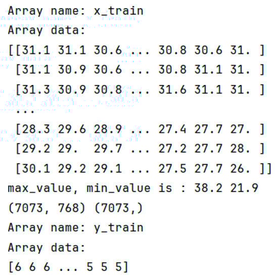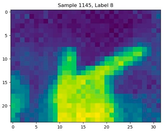 In Figure 15, the data within the array file storing thermal imaging gesture data is displayed. It is observable that the x_train array contains 7073 arrays, each with a length of 768 data points. These 768 data points correspond to the temperature values of the 24 × 32 pixel points captured by the MLX90640 thermal imaging sensor, amounting to a total of 7073 sets of temperature data, or equivalently, 7073 thermal imaging images. The y_train array stores the labels corresponding to each image in the x_train array. In Figure 16, one of the images with a gesture label of 8 is presented when converting the data from the array into an image.