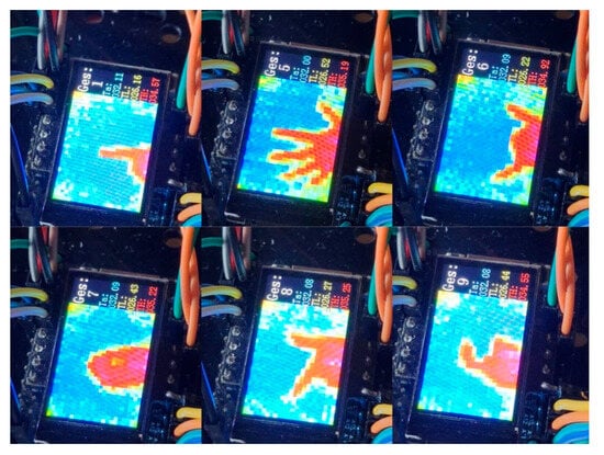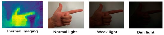 Thermal imaging technology relies entirely on the detection of infrared radiation (IR) emitted by objects, eliminating the need for any external light sources. This fundamental characteristic endows it with a faster processing speed compared to RGB imaging technology, as the absence of external lighting dependencies streamlines the signal acquisition and processing pipeline []. In recent years, driven by the decreasing costs of integrated chips, enhanced portability, and flexible design architectures, thermal imaging devices have witnessed a significant expansion in civilian applications []. These technologies are now widely employed in various fields, including body temperature screening [], insulation defect detection [], and electrical hotspot monitoring [], demonstrating their versatility and practical value in real-world scenarios. Due to the above advantages, thermal imaging technology and gesture recognition are becoming increasingly popular and widely used [].