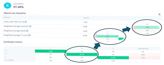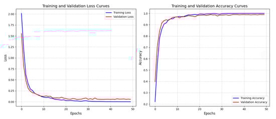 Figure 19 presents the trend of loss and accuracy changes between the training set and validation set during the model training process. The left figure shows the loss curve, and both the blue training loss and the red validation loss decrease rapidly with increasing training epochs (epochs) before stabilizing. The right figure shows the accuracy curve. The blue training accuracy and red validation accuracy quickly increased in the early stage and remained stable afterwards, and the loss and accuracy curves of the training set and validation set showed similar trends. The training results show that the model’s loss continues to decrease, and its accuracy steadily improves on both the training and validation sets with similar performance. After 50 epochs of training, the model achieves an accuracy of 99.05% and a loss value of 0.05. This indicates that the model’s learning is effective, with good generalization ability and certain robustness.
