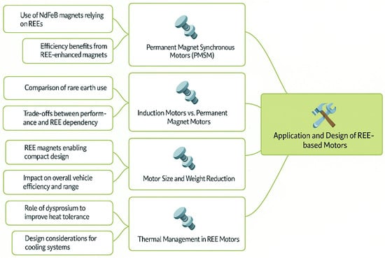In the automotive industry, traction control systems play a crucial role in ensuring vehicle stability and preventing wheel slip, especially during acceleration and cornering. A stability-guaranteed and energy-conserving torque distribution strategy is proposed for vehicles using an innovative master–slave control framework to address these issues. To deal with the issue of single torque distribution targets, a multi-target coordinated control approach that considers both stability and economy is proposed, which includes a coordination decision controller, a high-level motion controller, and a low-level allocation controller []. The high-level motion controller consists of a bicycle model with two degrees of freedom, a speed tracking controller, a stability controller, and an economic controller to calculate the desired direct yaw moment of four in-wheel motors. Advanced control strategies, such as hierarchical control, can effectively manage the complexity and over-actuation challenges associated with independently actuated electric vehicles, enhancing vehicle stability and driving performance []. Wheel torque control strategies should meet the demand for improved vehicle steering maneuverability and energy savings while balancing the slip ratio of the four wheels to prevent excessive wheel spin []. The types of rare-earth elements (REEs) in electric vehicle motors and their application and design in different types of motors are manifested in Figure 1 and Figure 2.