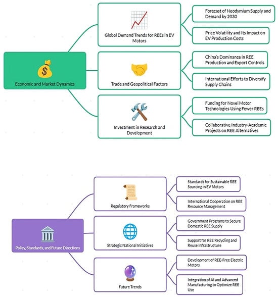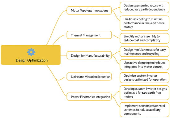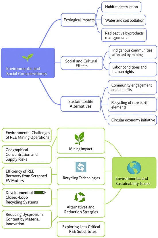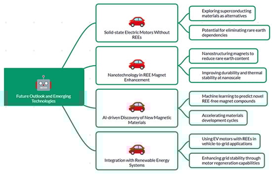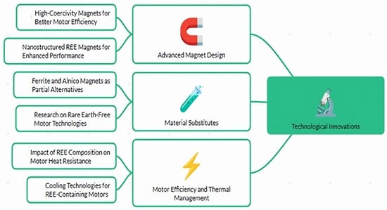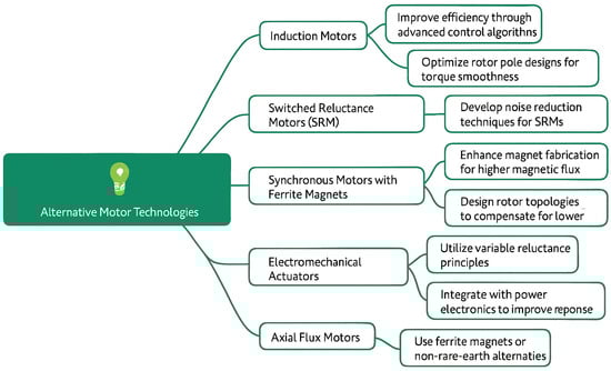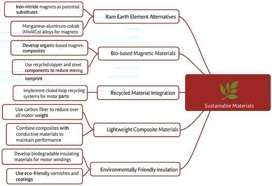 Rare-earth magnets may not be needed for wound rotor synchronization, switching resistance, or induction motors. Many people are thinking about purchasing these cars instead of electric cars. Using different motors could reduce the use of rare-earth elements. Reluctant switching motors are low in cost, easy to manufacture, and are fault-tolerant. However, they have a larger torque spread and lower torque density than permanent magnet motors. Electric vehicles often use induction motors because they are durable, reliable, and do not require rare-earth magnets. The ability to control sudden torque variations enhances vehicle stability and reduces energy consumption []. Advanced control strategies—such as fuzzy logic control—enable dynamic prioritization of control objectives through a multi-objective online optimization function, improving both stability and economic performance in various driving conditions [].In place of permanent magnets, synchronous reluctance motors use copper windings to generate magnetic fields. Researchers are studying how these motors are built and controlled to reduce reliance on rare-earth materials. Another alternative is the switched reluctance motor, which generates torque through magnetic reluctance. While it is more cost-effective and suitable for electric vehicles, it tends to produce more noise and torque ripple compared to permanent magnet motors. Additionally, certain synchronous motors operate using capacitive power transmission without the need for permanent magnets, even when damaged, and have demonstrated good performance []. As part of the push for rare-earth-free solutions, Figure 3 presents sustainable material alternatives.