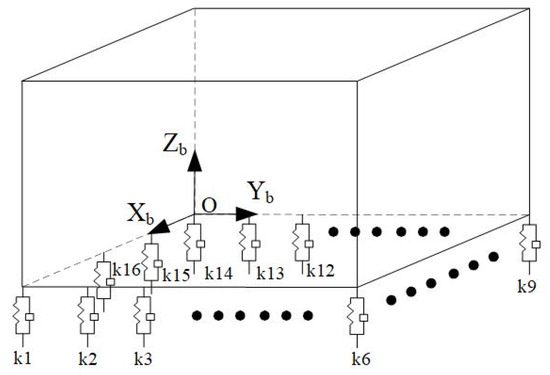 Without loss of generality, the coordinates of the center of mass in a static state are . In the preliminary design of this battery pack mounting system, 16 mounts are uniformly arranged on the bottom of the battery pack. The mounts are regarded as elastic elements with tri-axial stiffness (in the X-, Y-, and Z-directions). The coordinate positions of each mounting point are listed in Table 1.