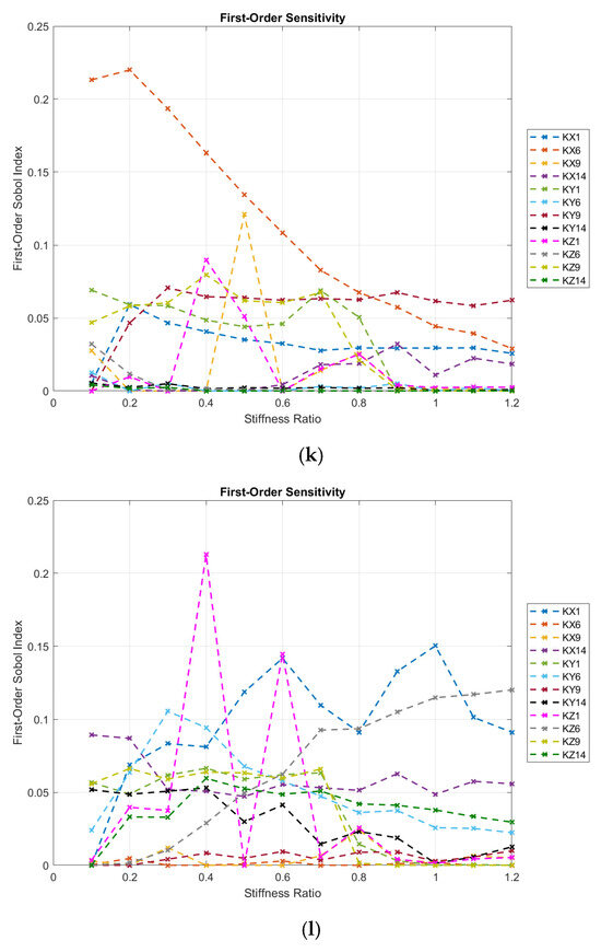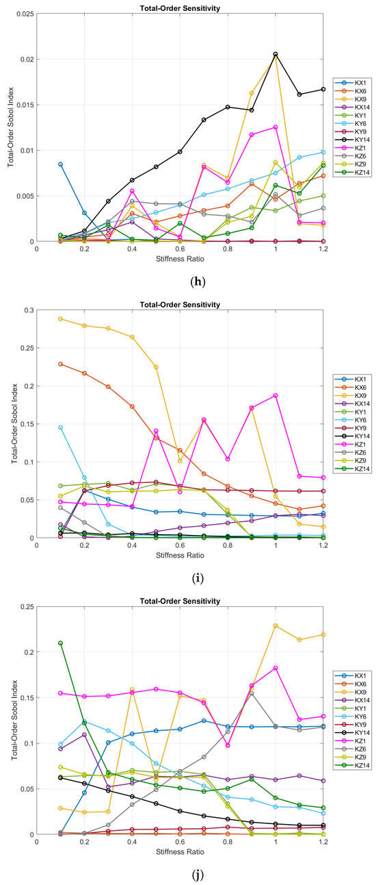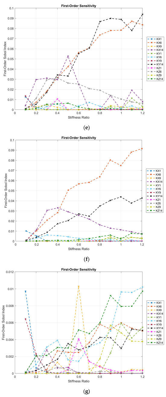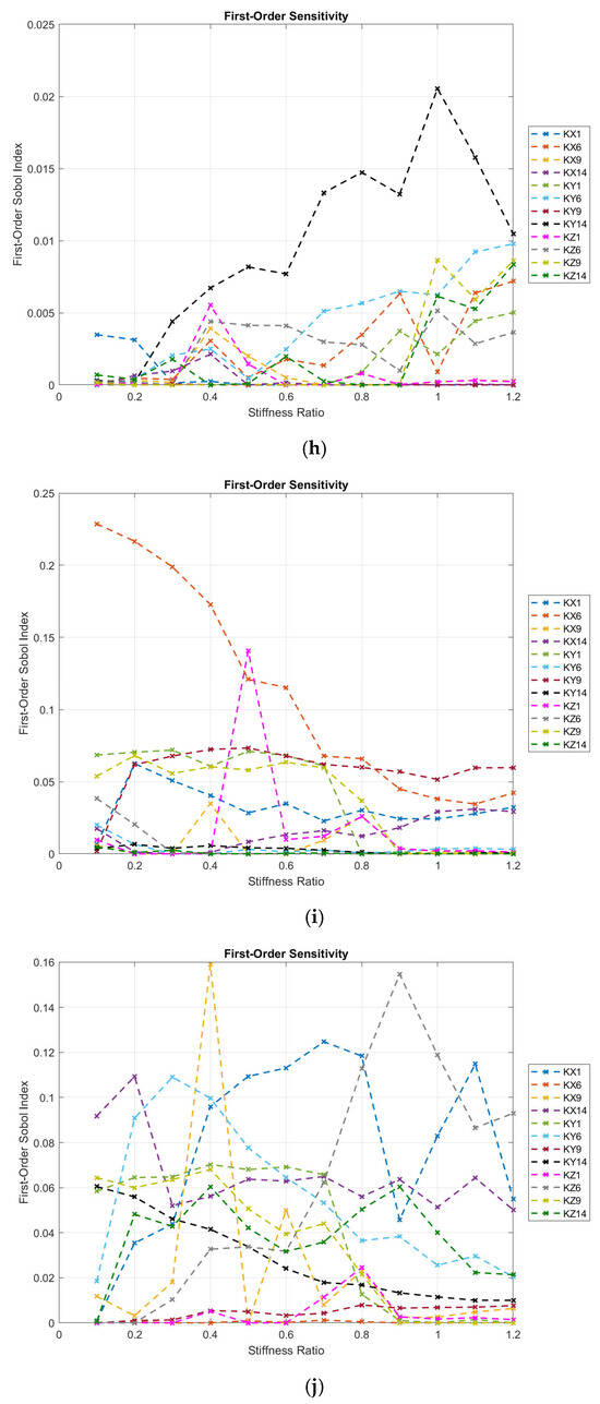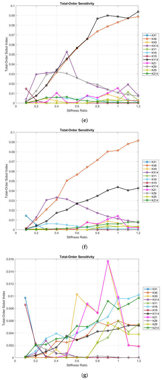 Figure 5 shows that the first-order Sobol sensitivity indices of the various stiffness parameters are strongly dependent on the stiffness ratio. The graphs exhibit clear sensitivity crossover phenomena, where the dominant influencing parameter changes as the stiffness ratio is altered, showing different characteristics depending on the evaluation metric. Additionally, some parameters show sharp sensitivity peaks in specific narrow regions. For example, for KX9 in the second and third natural frequencies, as the stiffness ratio changes from 0.1 to 0.3, the sensitivity rapidly drops from 0.14 to nearly 0. Therefore, the importance ranking of parameters is dynamic, and the system has highly sensitive regions to changes in certain parameters under specific configurations. These highly sensitive regions should be avoided in the design process.
