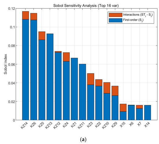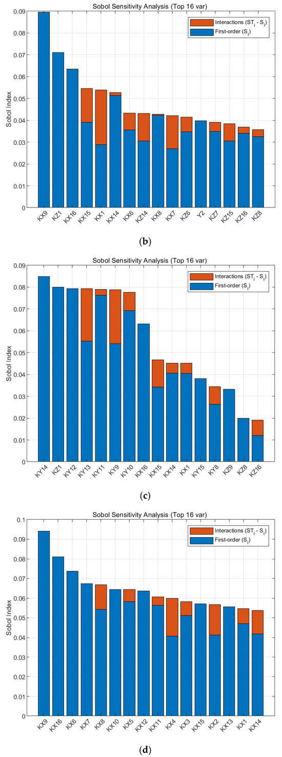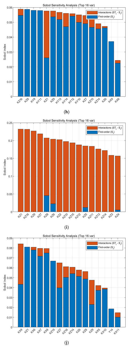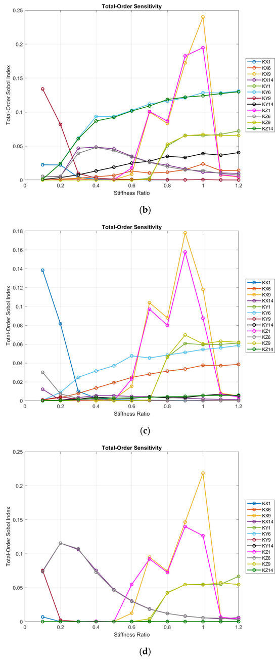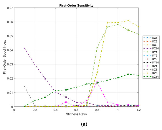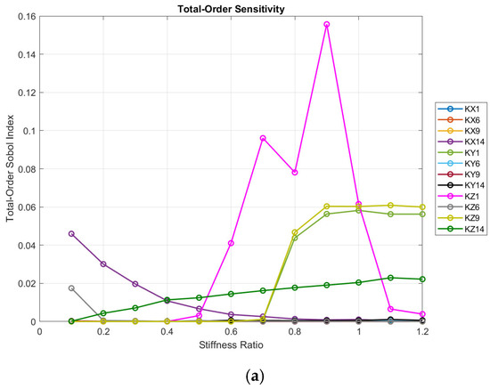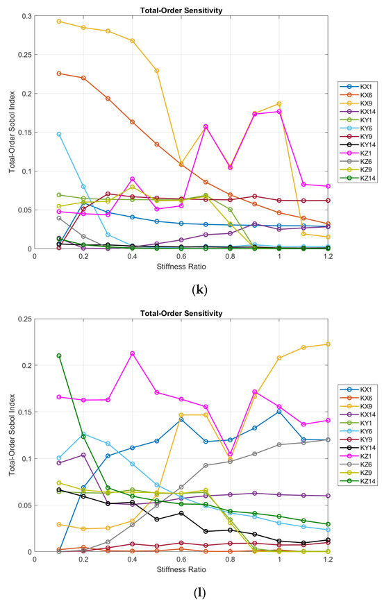 Figure 5 shows that the first-order Sobol sensitivity indices of the various stiffness parameters are strongly dependent on the stiffness ratio. The graphs exhibit clear sensitivity crossover phenomena, where the dominant influencing parameter changes as the stiffness ratio is altered, showing different characteristics depending on the evaluation metric. Additionally, some parameters show sharp sensitivity peaks in specific narrow regions. For example, for KX9 in the second and third natural frequencies, as the stiffness ratio changes from 0.1 to 0.3, the sensitivity rapidly drops from 0.14 to nearly 0. Therefore, the importance ranking of parameters is dynamic, and the system has highly sensitive regions to changes in certain parameters under specific configurations. These highly sensitive regions should be avoided in the design process.