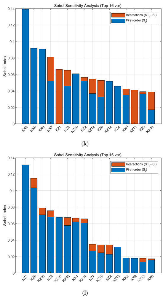 Figure 6 shows that the total sensitivity indices of the parameters also exhibit a strong dynamic dependence on the stiffness ratio. This indicates that the interaction effects of the decision variables are not constant. The graphs also clearly show the transition of dominant influencing parameters (crossover phenomena) and sensitivity peaks in specific regions. Therefore, from a global perspective, the importance of parameters and the strength of their interactions are dynamically changing with the system state. Identifying these highly sensitive configurations is crucial for assessing the overall uncertainty and robustness of the model.