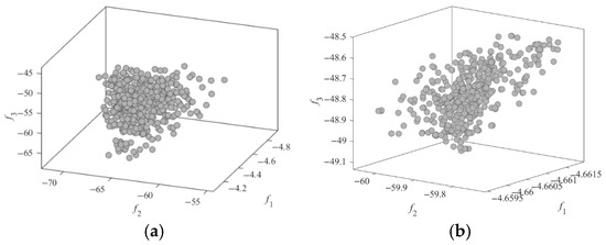 In each run, the maximum number of evaluations was set to 50,000, meaning the algorithm performed 50,000 calls and evaluations of the objective functions during the search process. At the same time, to better capture the diversity and convergence characteristics of the solutions during the evolutionary process, 500 representative population individuals from each run were retained for analysis. The number of algorithm iterations was uniformly set to 100 to observe the performance differences between the two algorithms in terms of optimization effect, solution distribution, and decoupling characteristics within the same evolutionary period.