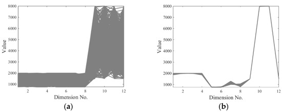 As shown in Figure 8, the MOEA/D-CMT algorithm shows a clear advantage in its search capability in the variable space. The solution set it obtains exhibits higher combinatorial diversity and distribution breadth in the variable dimensions, with a larger and more uniform range of variable values. This indicates that the algorithm has a stronger global exploration capability, can fully explore the decision space, and can effectively avoid getting trapped in local optima, thereby obtaining a more representative and feasible solution set. In contrast, the variable distribution of the solutions obtained by the NSGA-II algorithm is relatively concentrated, with limited coverage in some variable dimensions, indicating a weaker exploration capability in the variable space. This tendency toward local distribution may lead to premature convergence, reducing the diversity and practicality of the solution set and limiting the possibility of providing multiple options for comparison and selection for decision-makers in practical problems.