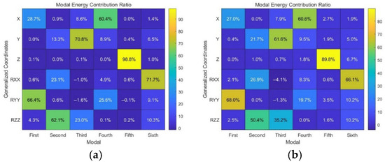 Furthermore, in terms of modal decoupling rates, the battery pack exhibits low decoupling rates in the Y-direction translation and Z-axis rotation degrees of freedom, at 59.5% and 50.8%, respectively, which do not meet the desired level of modal independence. This coupling characteristic may lead to dynamic energy coupling and mutual excitation of vibrations between these two degrees of freedom, reducing the system’s vibration isolation effectiveness. Therefore, it is necessary to focus on improving the decoupling rate parameters in these two directions in the subsequent optimization design to enhance the system’s stability and anti-interference capability under actual working conditions.