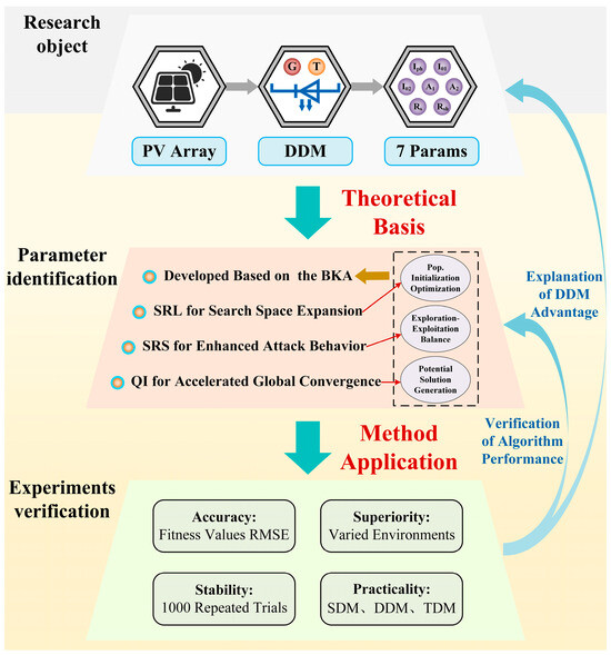 Inspired by these findings, this work aims to enhance the performance of the BKA by embedding targeted hybrid mechanisms tailored to the characteristics of PV model parameter identification. To the best of our knowledge, this study is the first to integrate SRL, SRS, and QI into the BKA framework, yielding a novel metaheuristic termed the SRQ-BKA. This algorithm is designed to overcome the limitations of the BKA, including limited population diversity, inadequate local search capability, and slow convergence in multimodal landscapes. Specifically, SRL is employed to enhance population diversity and prevent premature convergence. Subsequently, SRS balances global exploration and local exploitation, whereas QI accelerates convergence and refines solutions near the optima. This integrated design enables the SRQ-BKA to achieve more accurate, robust, and stable parameter identification across diverse environmental conditions. Finally, the effectiveness and engineering applicability of the SRQ-BKA are validated through comprehensive benchmark tests and real-world PV experiments. Figure 1 illustrates the structural composition and operational flow of the proposed SRQ-BKA. In summary, the key contributions of this paper are as follows: