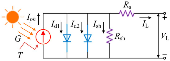 where I and V are the current and voltage. I01 and I02 are the saturation currents of the two diodes, respectively. Rs and Rsh indicate the equivalent series resistance and equivalent parallel resistance, respectively. A1 and A2 are ideal factors. Vth is the thermal voltage and the equation is Vth = kT/q. k denotes the Boltzmann constant, which takes the value of 1.381 × 10−23 J/K. T is the temperature of the PV cell. q represents the electron charge, with a value of 1.602 × 10−19 C. N is the number of cells in a PV module.