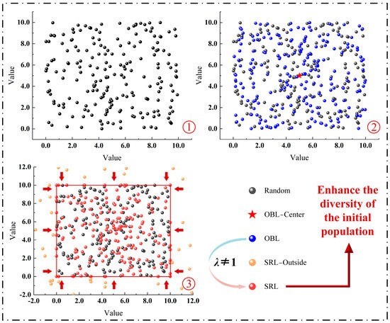 Compared with random initialization, SRL enhances both population diversity and quality through dynamic mirror-based mapping and selective refinement, producing a more diverse and higher-quality initial population for subsequent optimization. To validate the effectiveness of SRL, Figure 4 compares the initial population distributions of random initialization, OBL, and SRL within the original boundary range of [0, 10]. The randomly initialized population exhibits irregular clustering, leaving large gaps in some regions of the search space. Although OBL yields a symmetric distribution about the central axis, it remains strictly confined within the original range, making it inflexible and less effective in exploring boundary regions. Conversely, SRL generates a solution set that extends beyond the original boundaries through the dynamic elasticity factor, thereby enhancing diversity and reducing the risk of early stagnation in local optima. During mirror-solution generation, SRL allows temporary excursions beyond the boundary, which are then truncated to retain feasible components. Thus, SRL effectively enhances the initial exploration capability of MAs, providing a robust and efficient foundation for global search.