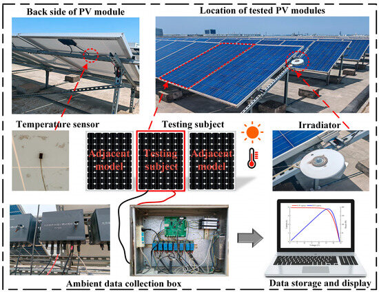 The experiments were conducted on the rooftop of the laboratory building at Hohai University in Changzhou, China, which has a typical subtropical monsoon climate. Three representative environmental scenarios were selected to capture the PV module performance under varying operating conditions: Condition 1: irradiance of 379 W/m2 and temperature of 27.9 °C; Condition 2: irradiance of 590 W/m2 and temperature of 36.5 °C; Condition 3: irradiance of 900 W/m2 and temperature of 47.8 °C. These datasets comprehensively reflect the actual output characteristics of the PV module under diverse environmental conditions.