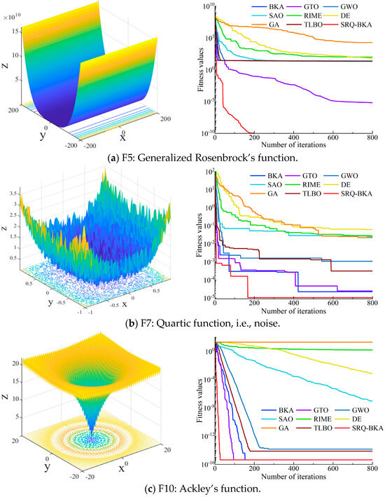 The F5 function, known as the Rosenbrock function, features a narrow, curved parabolic valley. It is commonly used to assess an algorithm’s ability to converge to the global optimum in complex local landscapes, particularly evaluating its capability to escape local minima. The F7 function incorporates quartic terms and random noise, which evaluate an algorithm’s robustness and noise resistance, making it suitable for validating convergence accuracy and result stability. The F10 function, derived from the Ackley function, is a typical multimodal function containing many local minima and is highly sensitive to initial solutions. It is particularly suitable for evaluating the global search capability of optimization algorithms and their effectiveness in escaping local optima.