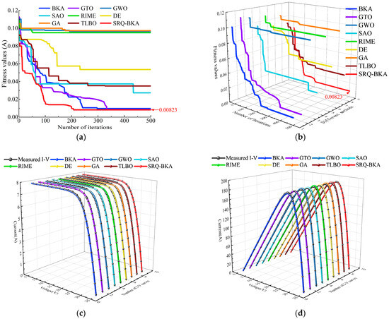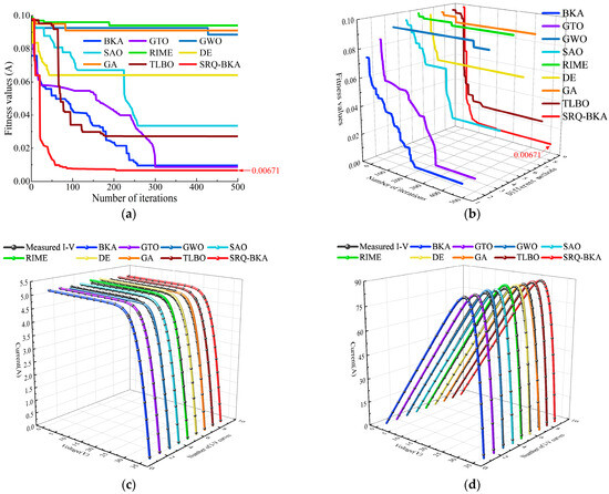 In conclusion, the DDM exhibits high computational accuracy and strong applicability in PV modeling, particularly achieving the best performance when optimized using the BKA, GTO, and SRQ-BKA. Additionally, the SRQ-BKA method not only fully leverages the theoretical advantages of the DDM but also demonstrates outstanding identification accuracy in the SDM, DDM, and TDM, further confirming its practicality and reliability. As a result, the combination of the DDM with SRQ-BKA optimization holds significant development potential and provides superior solutions for PV-system modeling.