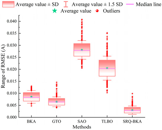 Figure 13 shows that the RMSE of the SDM is higher than that of the DDM and TDM. For the SRQ-BKA, GTO, and BKA optimization methods, the RMSE values of the DDM and TDM are quite similar. Among these methods, the lowest RMSE value is achieved by the SRQ-BKA. The experiment indicates that the DDM offers an accuracy advantage, along with strong applicability and development potential. Furthermore, the SRQ-BKA demonstrates high accuracy in the SDM, DDM, and TDM, further validating the practicality of the proposed method.