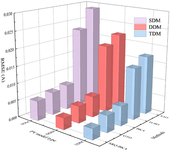 From an overall accuracy perspective, the RMSE of the DDM is lower than that of the SDM, indicating its higher accuracy in PV modeling. Moreover, for the DDM and TDM, the parameter-identification accuracy of the same optimization methods is similar, but the performance of the three leading methods is particularly outstanding.