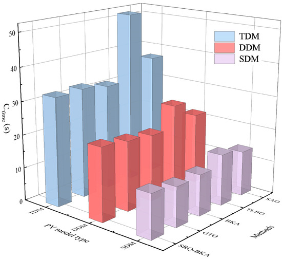Table 15 shows the parameter-identification speed of the three models, indicating that the identification speeds of the SRQ-BKA, GTO, and BKA are similar for the corresponding models. Figure 14 illustrates that the Ctime for the TDM is higher than that of the DDM and SDM. Within each corresponding diode model, the Ctime values of the SRQ-BKA, GTO, and BKA are quite similar. In terms of overall computational cost, the SDM achieves the fastest speed; however, as shown in Figure 13, its identification accuracy is not guaranteed. Moreover, the Ctime of the DDM is lower than that of the TDM, indicating that the DDM offers higher efficiency in PV modeling. Specifically, the Ctime values of the SRQ-BKA, GTO, and BKA for DDM identification are 21.89987 s, 20.94537 s, and 20.12758 s, which are significantly lower than the corresponding TDM values of 32.59736 s, 32.95732 s, and 31.80107 s.