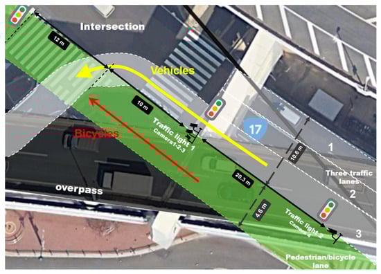 To ensure representativeness under real-world conditions, the experimental design accounted for factors such as traffic volume, lane configuration, frequency of left-turning vehicles, and observation angles. The Itabashi district in Tokyo was selected as the primary research site due to its high rate of traffic accidents. According to official data, the number of personal injury traffic accidents increased from 844 in 2021 to 1005 in 2022 and remained nearly constant at 1004 in 2023, indicating an overall upward trend [17,18,19]. A signalized intersection allowing both straight and left turns at the Itabashi Junction Overpass on Route 17, Japan, was selected for detailed observation because of its high traffic volume and complex layout. The intersection consists of three straight lanes (total width: 10.6 m) adjacent to a pedestrian crosswalk frequently used by cyclists (width approximately 4.6 m), as illustrated in Figure 1. The structural complexity of the intersection and its history of left-turn collisions make it an appropriate site for analyzing typical conflict scenarios between left-turning vehicles and crossing cyclists.