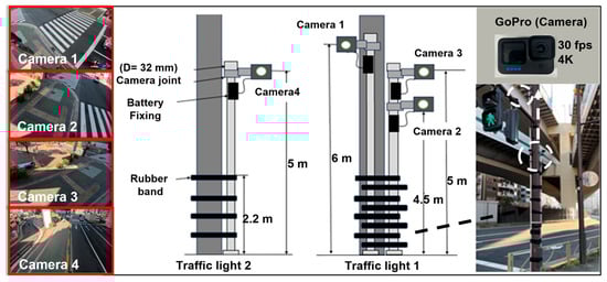 The intersection layout and experimental setup are illustrated in Figure 1 and Figure 2. As shown in Figure 1, yellow arrows indicate the trajectories of left-turning vehicles, while red arrows represent bicycle paths along the designated pedestrian–bicycle corridor. Three standard traffic signal heads (red, amber, and green) regulate vehicle and cyclist movements. Signal phases for bicycles and pedestrians are separated, implementing a protected crossing strategy to minimize conflicts during green phases. Under Japan’s traffic signal system, left-turning vehicles are generally permitted to proceed during the same green phase as crossing pedestrians and cyclists. Although drivers are legally required to yield, misjudgment, limited visibility, and underestimated cyclist speed often lead to conflict risk. The overlapping movement paths at this intersection represent the primary scenario analyzed in this study. Four GoPro cameras (30 fps, 4K resolution) were mounted on traffic lights 1 and 2, providing overlapping, multi-angle views of both the left-turn lanes and straight-through bicycle paths, as shown in Figure 2. The system continuously recorded 7 h of traffic footage (07:00–14:00) on 26 October 2023, under clear and sunny weather conditions, coinciding with peak traffic periods [18]. This experiment was approved by the Ethics Committee of the National Transportation Safety and Environmental Laboratory (NTSEL), Japan.