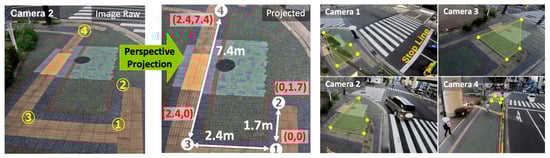 To convert pixel coordinates into real-world metric coordinates, a homography transformation was applied using a 3 × 3 matrix. Four precisely surveyed reference points within a 2.4 m × 7.4 m pedestrian area, as illustrated in Figure 4, served as calibration targets. These reference points enabled robust and accurate metric conversion across all camera views.