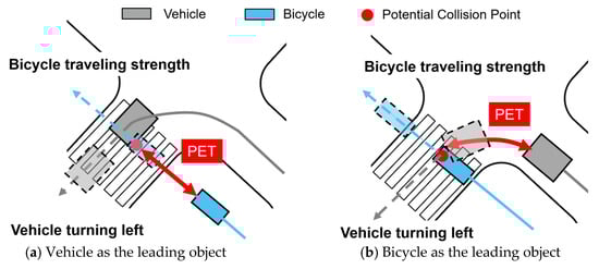 For each event, the object trajectories were analyzed to extract speed, acceleration, Kalman filter-based uncertainty, and behavioral indicators such as sudden braking and DRAC. To account for interaction sequence effects, the scenarios were categorized based on which road user—vehicle or bicycle—passed the potential collision point first. Figure 6 illustrates the definition of these scenarios, distinguishing whether the bicycle or the vehicle led the crossing. As shown, the severity of a potential collision varies depending on the leading object, underscoring the importance of differentiating interaction order in risk assessment [26].