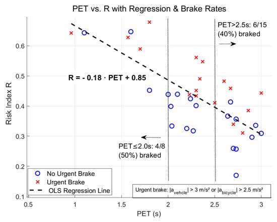 Urgent braking events were identified using thresholds of > 3 m/s2 or > 2.5 m/s2. The regression result was 0.85–0.18 PET, with an of 0.55, indicating that approximately 55% of the variability in the composite risk index is explained by PET alone. The intercept was 0.85 (95% CI: 0.714–0.980), and the slope was −0.18 (95% CI: −0.237 to −0.124); both are statistically significant (p < 0.001). This negative slope implies that a 1 s reduction in PET corresponds, on average, to an increase in the composite risk index of 0.18, highlighting the importance of time margin in risk assessment. Figure 7 illustrates the PET–R scatter plot overlaid with an OLS regression line. Circular markers denote cases without urgent braking, while crosses indicate events that included urgent braking. With the PET ≤2.0 s interval, all eight cases were categorized as high-risk (R > 0.40), and four of them (50%, 95% CI: 22–78%) involved urgent braking. Notably, even among the 15 cases in the PET >2.5 s interval, 6 cases (40%, 95% CI: 20–64%) involved urgent braking. This result demonstrates that a generous PET alone does not ensure safety, and emphasizes the necessity of including dynamic indicators such as high deceleration or DRAC to supplement PET-based thresholds.