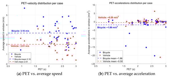 Figure 8a illustrates the average speeds of vehicles and bicycles across different PET intervals at the individual level. Here, the average refers to the arithmetic mean of the Kalman-filtered velocity and acceleration calculated over a ±30-frame window (60 frames total) centered on the PET frame. The results indicate that although overall speed tends to decrease as PET increases, notable variability exists within each PET range. The mean bicycle speed was 3.16 m/s, approximately 1.1 m/s higher than that of vehicles (2.01 m/s), suggesting that bicycles typically travel faster during conflict scenarios and thus contribute more substantially to collision kinetic energy.