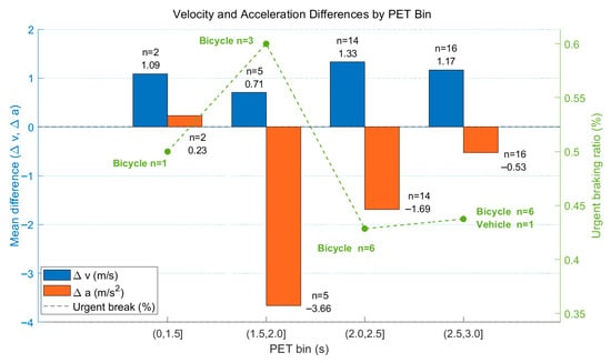 Additionally, Figure 9 provides a side-by-side comparison across four PET intervals, illustrating the average speed difference () and acceleration difference () between the follower and the leader. The right vertical axis shows the proportion of emergency braking events. The remains consistently positive (0.7–1.3 m/s), indicating that the following bicycle generally carries more kinetic energy. In the PET range of 1.5–2.0 s, Δa reaches its minimum (−3.66 m/s2), while the emergency braking rate for bicycles peaks at 60% (95% CI: 23–88%), suggesting that strong deceleration is the primary conflict resolution strategy. Even in the relatively safe PET range of 2.5–3.0 s, approximately 44% (95% CI: 23–67%) of events still involve emergency braking—primarily by vehicles—highlighting that a large PET alone does not fully mitigate risk.