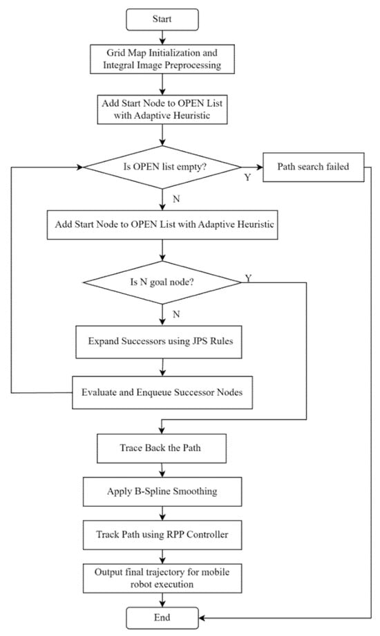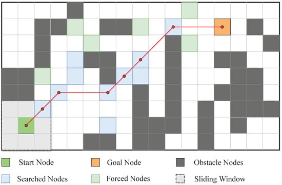 4]. This problem is particularly significant in environments with a high density of obstacles, where problems such as the frequent expansion of jump points, unstable jump directions, and sudden changes in paths become more evident. These factors have a negative impact on both path quality and execution stability.