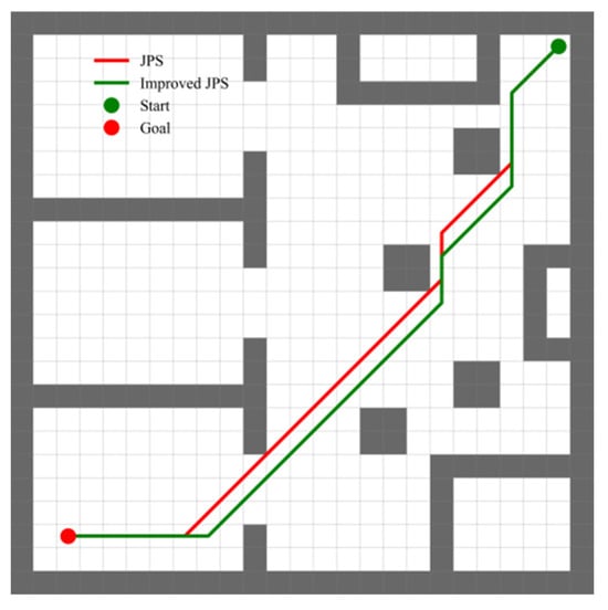 Figure 8, the improved JPS demonstrates a decrease in the number of extended nodes from 48 to 18 alongside a reduction in planning time from 1.60 milliseconds to 1.17 milliseconds. These changes represent a decrease of 62.5% in the number of extended nodes and 26.9% in planning time, respectively. It is noteworthy that this improvement in search efficiency and path security is accompanied by a slight increase in path length of approximately 1.8%.