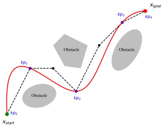 18] combined B-splines with incremental path flattening (IPF) to achieve efficient and safe continuous path generation in autonomous driving trajectory optimization, adopting a structure-aware collision correction mechanism and a curvature penalty strategy. Although these methods have made significant progress in path continuity and control effectiveness, they rely mainly on the equidistant or heuristic selection of control points, which limits their ability to systematically incorporate skip path structure semantics. Moreover, the optimization process of some of these methods may conflict with real-time requirements in barrier-dense environments.