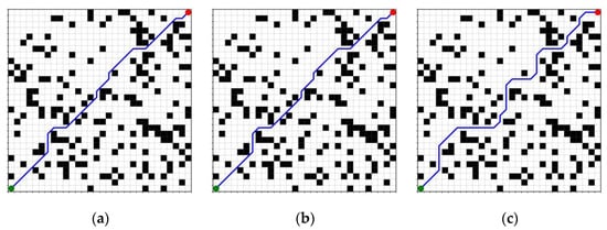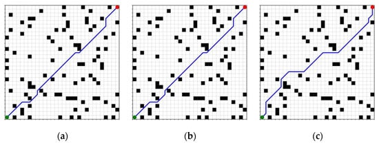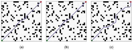 In order to evaluate the scalability and stability of each algorithm under different environmental scales, this section examines three different map sizes, which are 25 × 25, 50 × 50, and 100 × 100, respectively, while keeping the obstacle density constant at 0.15. The path length, planning time, and number of expansion nodes will be compared under these different map sizes for A*, traditional JPS, and improved JPS. This analysis aims to clarify the performance trends of algorithms in large-scale search spaces. The results of the path generation for the three algorithms across the specified map configurations are illustrated in
