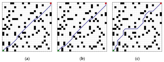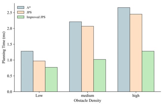 Figure 17 indicate that an increase in obstacle density leads to a notable rise in both the number of expansion nodes and the planning time for the A* and traditional JPS algorithms. Specifically, in high-density scenarios, the traditional JPS algorithm expands the number of nodes to a maximum of 146, resulting in a planning time of 2.45 ms, which signifies a marked decline in search efficiency. In contrast, the enhanced JPS algorithm effectively reduces the search space within the same environment, limiting the number of expanded nodes to 48 and decreasing the planning time to 1.28 ms, representing reductions of approximately 67% and 47%, respectively. This improvement in performance can be attributed to the implementation of a density-aware adaptive heuristic function that dynamically modifies the heuristic term based on the local distribution of obstacles, thereby minimizing unnecessary expansions while preserving path coherence. Although the path lengths generated by the improved JPS may be slightly longer in certain scenarios compared to the traditional JPS, this is primarily due to the algorithm’s tendency to circumvent obstacle edges and regions of high density during the search process. This approach enhances the feasibility of the paths and increases the safety margin, resulting in a minimal impact on the overall planning performance. To prevent redundancy, any similar phenomena that arise in the following sections will be considered as stemming from the same underlying cause and will not be reiterated.